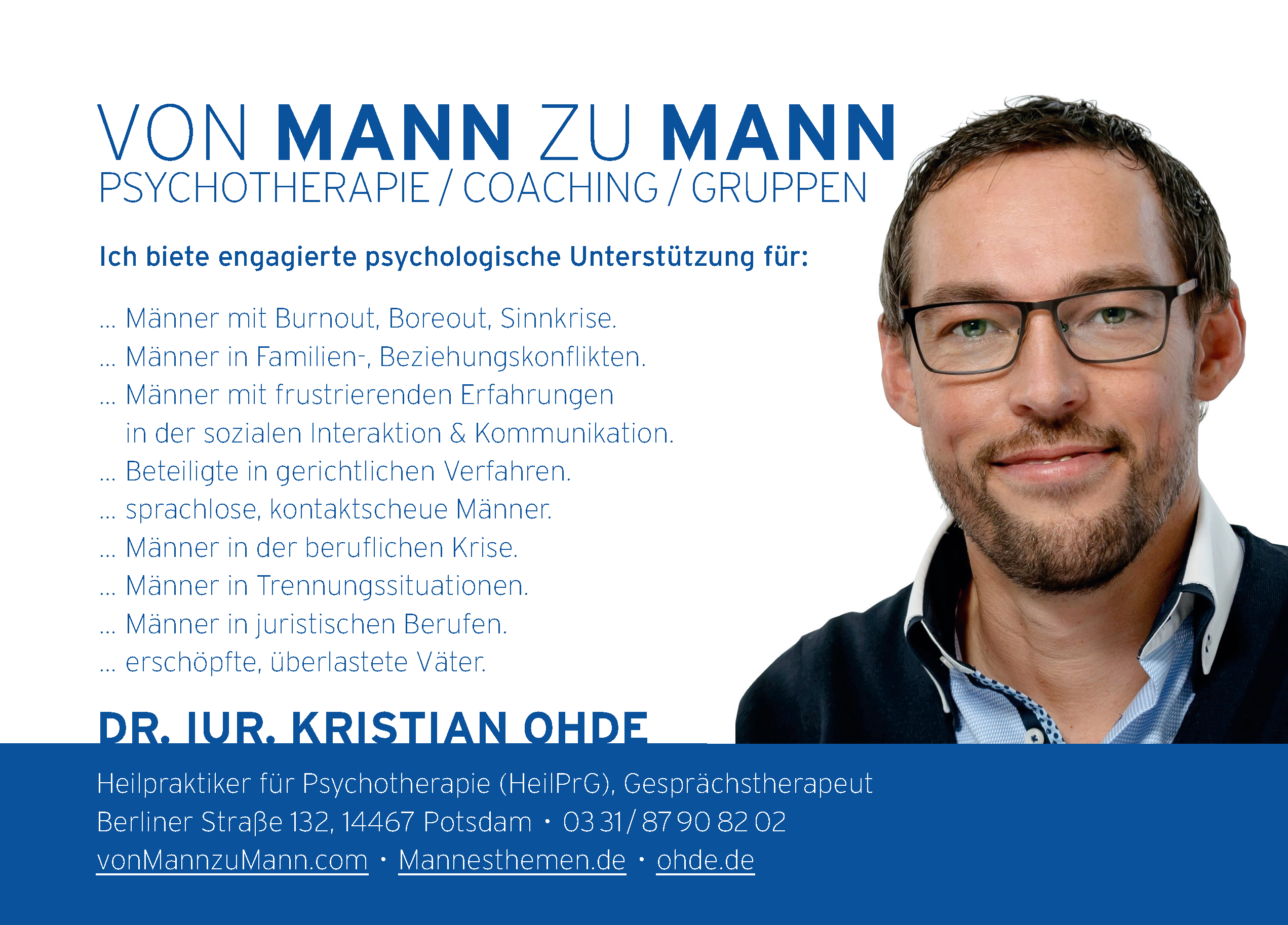 Sollten Sie meine Unterstützung in Form von Psychotherapie, psychologischer Beratung oder Coaching wünschen, informieren Sie sich gern auf meiner Seite vonmannzumann.com oder schreiben mir über das Kontaktformular oder rufen direkt an, um ein kurzfristiges Erstgespräch zu vereinbaren. Vor Ort in Potsdam oder online von zu Hause aus.
